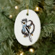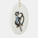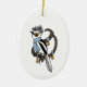 A white-crested helmetshrike sitting on a tangle of branches, wearing a blue scarf, while branches are decorated with golden bells hanging by blue ribbons. The eye of the bird is done in the same golden colour.