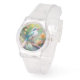 I only have one complaint. I ordered the watch with clear case and strap, and what was sent was white case and strap. I'm going to keep it because 1) it looks very nice in white, and 2) it would take too long to get a replacement made and sent in time for my occasion. Aside from the mix up with the color, the watch does look very good in white. The purple dial is actually sparkly which did not show in the online images. That was a nice surprise. If you like Swatch watches this is very similar to those. It's 33.6mm in diameter, 10.5mm thick, and 40.6mm lug to lug. Stainless steel case back says 3ATM/30m WR, so no swimming or showering or submerging this one. If you like Woodstock, this is a great choice.