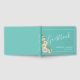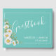 Pretty custom wedding guestbook design features watercolor white daisies corner on light teal background with white customisable text blocks in modern fonts