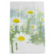Close up of white daisies in country meadow with watercolor frame for birthday.