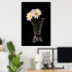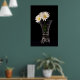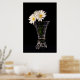 A photograph of beautiful white daisies with yellow centres in a glass vase against a solid black background.
