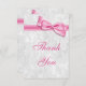 Elegant Thank You flat cards for girl's Baby Showers etc printed on invitation paper. Beautiful white damask pattern background with ornate swirls and flourishes a pretty, stylish, cute, girly pink bow and ribbon image. These glamourous, chic, classy thank yous are beautifully sophisticated and are decorated / printed on both sides. I have matching invitations and other matching products in my store. PLEASE NOTE: All invites on Zazzle have flat printed images. Bows and ribbons images purchased from digital-designs-by-elena. If you need any assistance customising your product please contact me through my store and I will be happy to help.