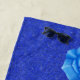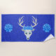 This custom beach towel is a dark vibrant blue with tiny white specks and the head of a white deer with large white antlers wearing blue roses. A blue rose is on each end of the towel also.