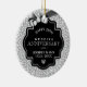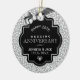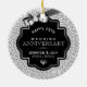 Elegant white incrusted diamonds pattern background with black and silver vintage frame for your customisable 25th wedding annyversary christmas ornament template.