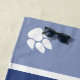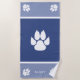 Destei's white dog paw silhouettes on a blue background colour. In the middle there is a large dog paw print while each corner features a smaller paw shape. The background colour in the middle is dark blue while the top and bottom have a lighter blue background colour. These areas are separated by white stripes. There is also a personalizable text area for a name.