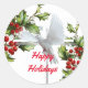 This sticker has a graphic of a white dove of peace flying with its wings arched upwards, flying across a white cross edged with red berries and green leaves and the words "merry Christmas" in a decorative calligraphy font.