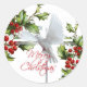 This sticker has a graphic of a white dove of peace flying with its wings arched upwards, flying across a white cross edged with red berries and green leaves and the words "merry Christmas" in a decorative calligraphy font.