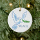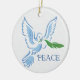This round metal Christmas ornament features a white dove holding an olive branch and the word "Peace".