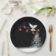 White dove with PEACE text ornaments on a string on black background and snowflakes.