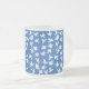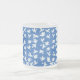 A pretty frosted glass mug with beautiful 'White Dove' design on a bright blue background, from a handpainted paper collage by Judy Adamson.