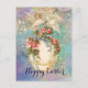 Elegant artistic vintage style floral Easter design with pink roses and digital painting and watercolor in teal,aqua blue,green colours with gold sparkles and silver foil by Bulgan Lumini (c)