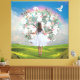 Modern Collage Wall Art. This one is the back of a girl with a white dress with large floral and Strawberry bouquet against a dramatic clouded rainbow sky with dove. Soft pastel flowers white, pinks and red. Fun, mod and eclectic ephemera. This is a flat surface with a smooth canvas finish. Fun, surreal art using a mix of collage and digital art techniques, with a vintage, mid-century retro feel.