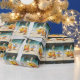 A group of three ducklings with colourful float rings and a small bucket enjoys a sunny day at the beach, accompanied by an adult white duck