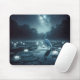 White egret standing amidst glowing white water lilies illuminated by ethereal light under a starry sky