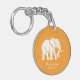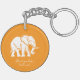 A white elephant on an orange keychain.