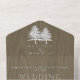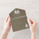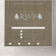 White embossed trees on sepia wood grain rustic winter all in one wedding invitation with tear off RSVP. A rustic winter wedding design that showcases two white conifer trees in embossed relief effect and the names of the couple in a decorative font.