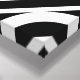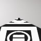 Bold geometric pattern features alternating thick and thin white diamonds with space between them on a black background. The thick diamonds each contain a thin white circle with a thick white equal sign at an angle inside. In contrast, the thin diamonds each contain a thick white circle that touches its edges with a thin tilted white equal sign inside.