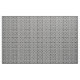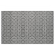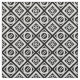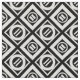 Stylish geometric fabric features a bold pattern of alternating thick and thin white diamonds with space between them on a black background. The thick diamonds each contain a thin white circle with a thick white equal sign at an angle inside. In contrast, the thin diamonds each contain a thick white circle that touches its edges with a thin tilted white equal sign inside.