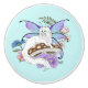 A pretty white cat with fairy wings sitting on a mushroom with flowers in a backdrop fo blue