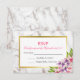 A fancy wedding RSVP with a modern design - a faux marble texture in white makes up the background. Layered over top is a rectangular frame with a gold gradient border. Large pink and purple watercolor magnolia flowers with green leafy accents decorate the design in the bottom right corner.