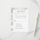 Design features text in the proper format for a response card. Text is displayed in an elegant, silver font within a silver border. Two small crosses are displayed at top on either side of heading. Just below heading, the words, "Répondez s'il vous plaît" are shown, displaying the words which the acronym stands for.