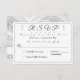 Design features text in the proper format for a response card. Text is displayed in an elegant, silver font within a silver border. Two small crosses are displayed at top on either side of heading. Just below heading, the words, "Répondez s'il vous plaît" are shown, displaying the words which the acronym stands for.