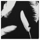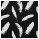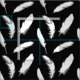 White feather print on a black background - mixed media graphic design of white feathers, floating on a contrasting background fabric