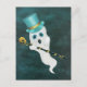 This postcard has a white ghost with a open mouth floating in a hazy black night sky wearing a blue top hat and holding a black cane with a gold skull and swirls.