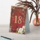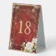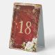 Gorgeous white botanical floral spray with sparse gold leaves over hanging this beautiful table marker. The scarlet red rustic background is such a rich classy look. We’ve outlined the number in a gold tone thin line twice. This is a lovely marker for your reception tables.. Trimmed in faux gold glitter to set the tone for romantic and classic elegance. Gold splashes finish off this pretty marker. Beautiful for any season.