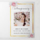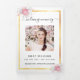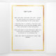 An elegant tri-fold program. A white background, a faux gold frame, pink and white florals and space for a photo. Personalise and add name, dates and your text.