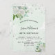 A modern, stylish and glamourous invitation for a woman's 40th (or any age) birthday party. A watercolored green background with faux silver glitter dust and white florals and greenery. The name is written with a modern black hand lettered style script. Personalise and add a name, age and your party details