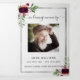 An elegant tri-fold program. A white background, a faux silver frame, burgundy florals and space for your photo. Personalise and add name, dates and your text.