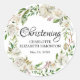Antique white watercolor roses form a beautiful wreath. Christening is written in a flowing script. The baby's name is written below with the date.