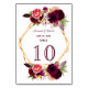 An elegant and romantic bohemian boho style table card. Watercolored feathers and roses, flowers in pink and burgundy. A faux gold geometric shaped frame on a white background. Templates for your names, date and table number. Burgundy coloured letters.