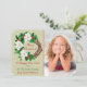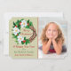 Your own photograph takes centre stage on the right side of this festive modern flat Holiday card. The left side has an image of an evergreen wreath decorated with white flowers and red berries. Predominant colours are green and red. Five custom text fields are in red and green. The back of the card has a pretty gold snowflake pattern over a matching red background.
