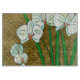 White flowers hang off green stems in this piece by Chariklia Zarris. Set against a tan background and surrounded by a brown border this is a simple but elegant painting. Add it to your home and enjoy the beauty!