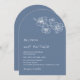 This elegant contemporary arched wedding invitation features white line art flowers and white script on a dusty blue background.