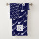 White small flowers on navy blue floral bath towel set. It showcases a pattern of small flowers and leaves and your monogram on navy blue background.