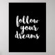 This is a beautiful art prints poster featuring follow your dreams quote in white. You can change the background color of the poster.