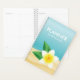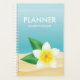 This tropical theme planner features Destei's illustration of a beautiful white Frangipani flower with two green leaves. The background has a beach theme including a sand texture and blue sky / water colour. There are personalizable text areas for the title of the planner and for a name.