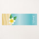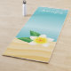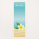 This yoga mat features Destei's original illustration of a beautiful white frangipani flower with two green leaves. The background colour is blue with a pattern mimicking the look of sand on the bottom. On the top there is a personalizable text area for a name in a beautiful white script font.