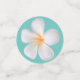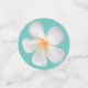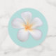 Wedding White Frangipani Plumeria Flowers on teal and light blue Table Confetti. Text can be personalised for wedding, anniversary,and Birthdays. Frangipani flowers stand for beauty and perfect love.