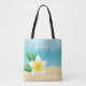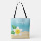This tote bag features Destei's illustration of a white and yellow colour frangipani plumeria flower with green leaves. The background colour is blue with sand texture on the bottom. There is also a personalizable text area for a name.