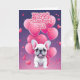 On the front of this cute Valentine's Day card is the image of an adorable white French Bulldog with many pink balloons. Around him are numerous pink floating hearts on a purple pink gradient background. The pink and white text says "Happy Valentine's Day". The inside currently says "You make my tail WAG". The inside text is customizable, so you may personalize the card or make it say anything else you'd like.