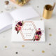 A white background, rose gold foil text. Decorated with a geometric frame and florals in burgundy and pink. Personalise and add your names and the wedding date.