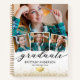 Modern graduation party guest book featuring a simple white background that can be changed to any colour, 4 photos of the graduate, elegant gold glitter, a mortarboard, their name, class year, and the school or college they attended.