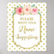 Name suggestions sign poster for baby shower in white and gold dots pattern with gold border, rustic pink and peach watercolor flowers and handwritten style lettering.