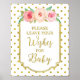 Wishes for baby sign poster for baby shower in white and gold dots pattern with gold border, rustic pink and peach watercolor flowers and handwritten style lettering.