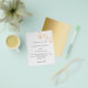 A modern, elegant and minimalist wedding invitation. Front: an elegant white background decorated with faux gold florals. Personalise and add your names and wedding details. Black coloured letters.