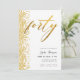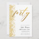 A white and gold, glam, modern, elegant and chic 40th birthday party invitation template featuring the word "forty" covered in gold foil (this is a digital effect), modern calligraphy script and typography in a gold hue, as well as a geometric motif inspired by glitter: gold and pink dots. A chic, timeless design for a woman on her fortieth birthday.